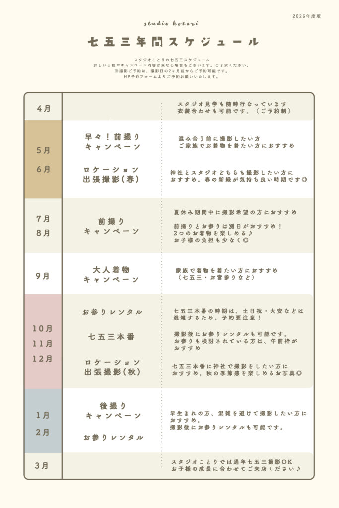 スタジオことりでは、七五三シーズンの9月〜11月以外でも、通年で七五三の撮影を行っています!